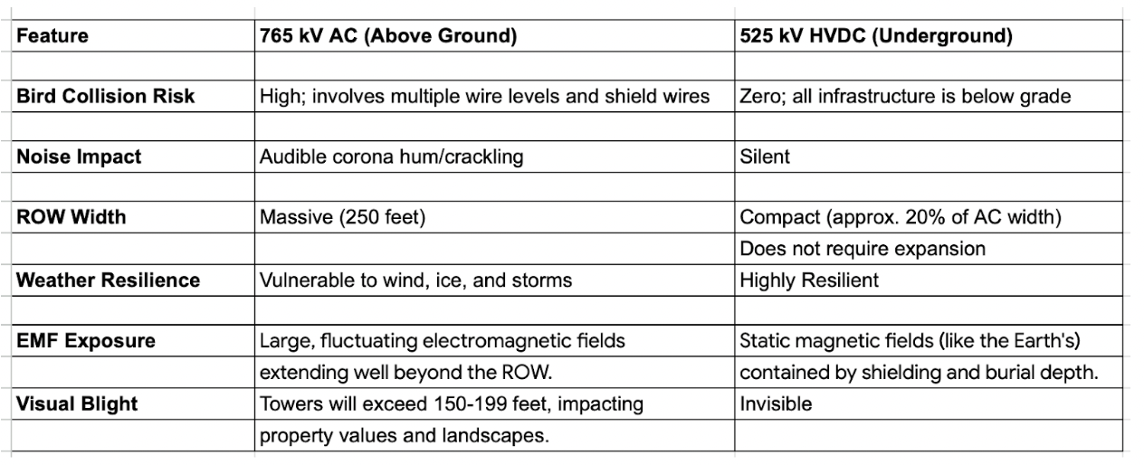Lower Footprint: Because the 765 kV AC line is notably less efficient, the utility must generate significantly more power to deliver the same amount to end-users.